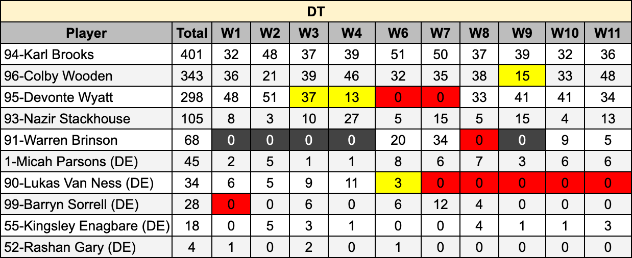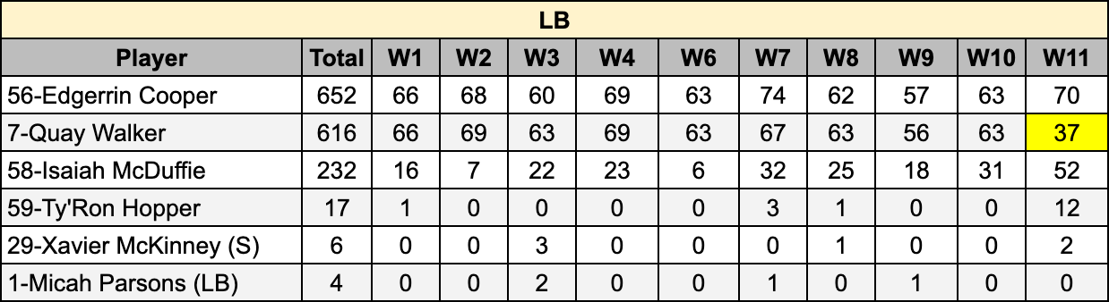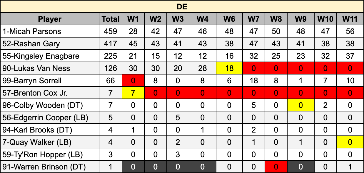 The team might have been trying to keep Gary fresh after he was unable to produce much early on in the season, outside of the cleanup sacks created by Micah Parsons’ pressures. The tune down of snaps, to the benefit of Kingsley Enagbare, hasn’t worked, though, as Gary is still on pace to have the worst pass-rushing season in his NFL career.