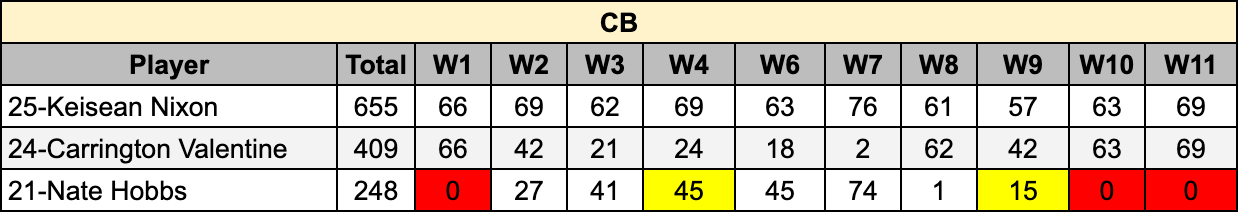 All of the cornerback snaps this week went to Keisean Nixon and Carrington Valentine, which shouldn’t be surprising. What might be a little surprising to folks, though, is that Nixon and Valentine are both performing above the NFL average.