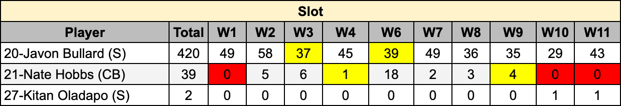 With Nate Hobbs out with a knee injury, it’s still all Javon Bullard in the slot. The one rep that Kitan Oladapo got in the slot this week was on the end-of-game play in prevent defense, where the Packers played three high safeties and double slots, the same as Oladapo’s only other slot rep in 2025 — which came last week.