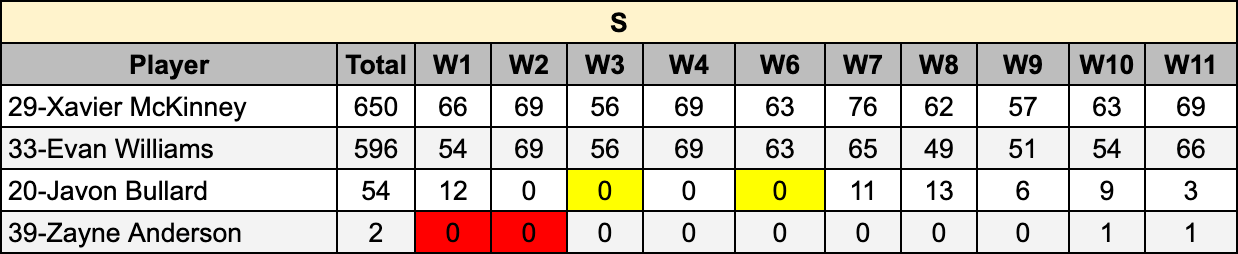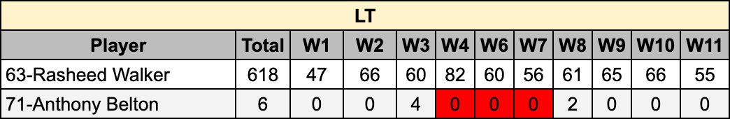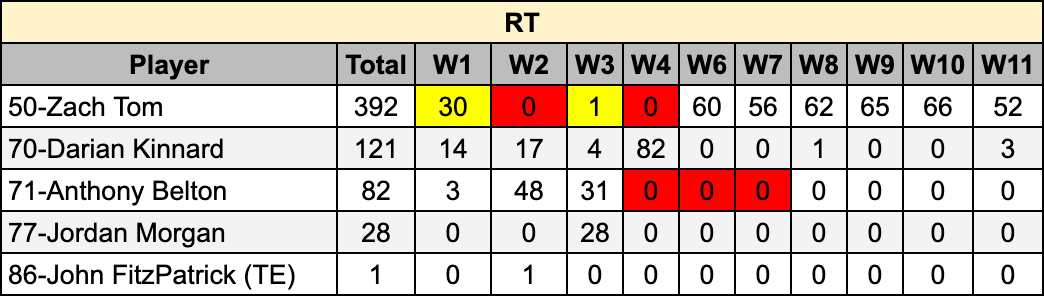 As always, the snap counts below do not include plays with pre-snap penalties (like false starts), spikes or kneel, but they do include plays with post-snap penalties (like holding). Cells in red mean that a player was unable to play the game due to injury. Cells in yellow mean that a player was unable to finish the game due to injury. Cells in black mean that a player was a healthy scratch in the game.