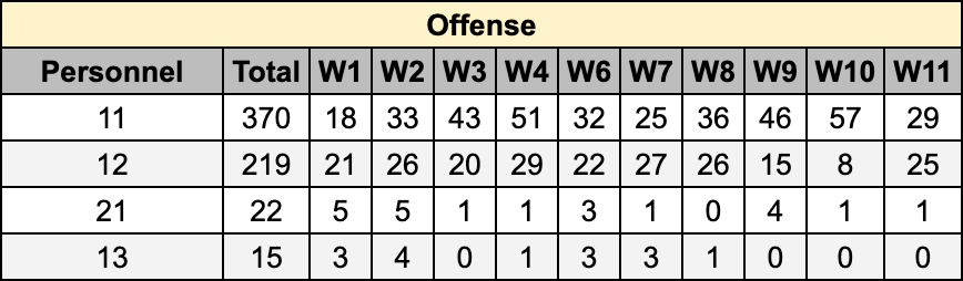 So much for that short-lived 11-personnel revolution in Green Bay. When tight end Tucker Kraft went down with his ACL tear, many expected the Packers to live in three-receiver sets for the remainder of the season. While that was the case in Week 9 and Week 10, the games in which Green Bay played their highest rate of 11 personnel looks (71 percent and 81 percent) all season, the script flipped this past week.