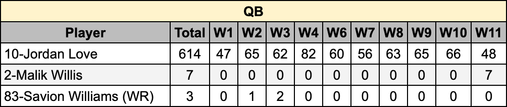 Hey, Malik Willis finally got some action this week when Jordan Love went out for half a series with an injury to his left shoulder. Willis went two of two for six yards and a score, along with a carry for 16 yards, to finish that drive.