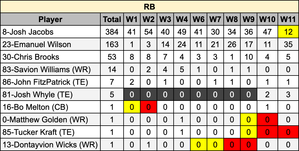 Josh Jacobs left the Giants game after the Packers’ first touchdown drive, and it’s uncertain whether he’ll be able to play this week against the Minnesota Vikings. If Jacobs is out, expect a healthy dosage of Emanuel Wilson, who out-snapped Chris Brooks 35-5, despite the Jacobs injury.