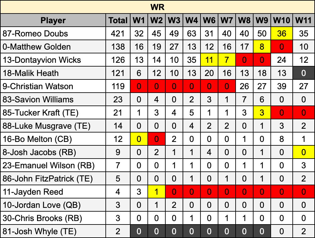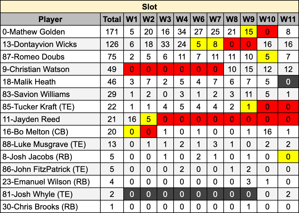 The way the Packers got into those looks, though, was by playing running backs and tight ends as outside receivers, essentially using them as the players on run-off routes, while playing their more premium pass-catching targets in the slot on those plays. That’s why you’ll see the bump in slot rate for Romeo Doubs and Christian Watson, despite Malik Heath (outside receiver) being out and Matthew Golden (who has mostly been playing the slot since Watson returned from injury) being in.