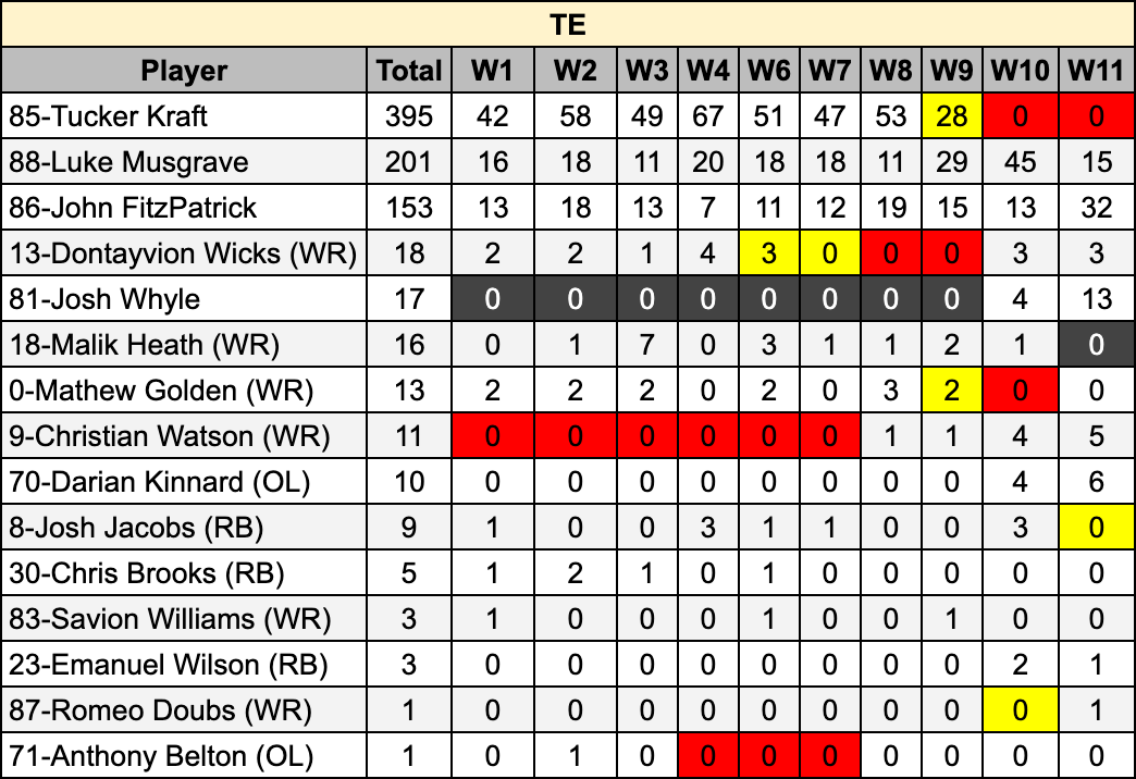 Last week, Luke Musgrave was the replacement starter for Tucker Kraft. This week, John FitzPatrick more than doubled Musgrave’s snaps played. That seems to be an accident, though, as head coach Matt LaFleur said in his Monday press conference that he told his staff that Musgrave needs to be playing more snaps. Notably, Musgrave only played two snaps in the entire second half against the Giants.