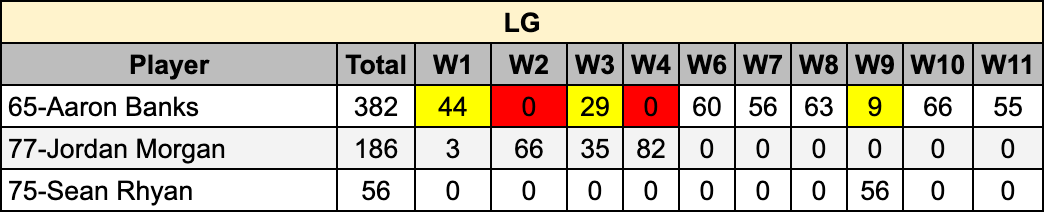 Outside of the three snaps that Darian Kinnard came in to play for an injured Zach Tom, the Packers’ preferred starting offensive line of Rasheed Walker, Aaron Banks, Sean Rhyan, Jordan Morgan and Tom (left to right) played all of their snaps together. Sunday’s action was another example of the team clearly having different backup tackles, by the way. Since Week 4, Kinnard has been the backup right tackle, while Anthony Belton has been the team’s backup left tackle. Expect that to continue.