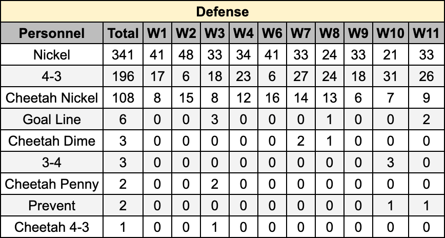 Over the last two weeks, the Packers have had to play a LOT of base defense. In Weeks 10 and 11, they’ve only been able to play a lighter personnel than their 4-3 base defense 54 percent of the time. From Week 1 through Week 9, Green Bay was playing lighter subpackages 73 percent of the time.