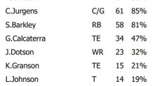 • Fred Johnson started the game as a tight end in the jumbo package but then filled in for Lane Johnson at right tackle. He played a total of 62 snaps (86%). But the Eagles didn’t scrap their jumbo package after the injury to Lane Johnson. Matt Pryor got four snaps in that tight end role.