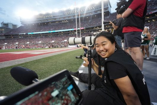 The Lantern photographer Sandra Fu covers the Ohio State Ohio University football game on Sept. 13, 2025. Credit: Courtesy of Doral Chenoweth