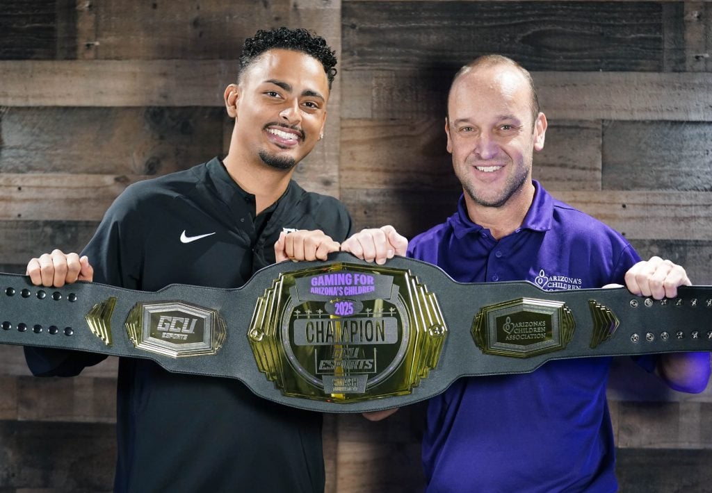 GCU Esports Director of Operations Jay DeShong (left) and Arizona Children’s Senior Director of Development Jim Van Wicklin hold the champion’s belt for the winner of the Gaming for Arizona’s Children tournament fundraiser.