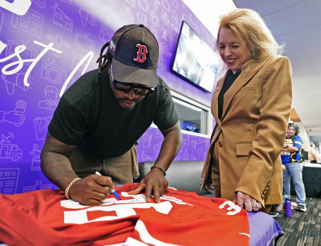Former San Francisco 49ers linebacker Marcell Harris signs a jersey as Arizona Children’s sponsor Pat Peyton looks on during the Gaming for Arizona’s Children tournament fundraiser.