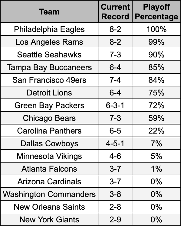 According to NFL Pro, seven NFC teams have a playoff percentage of 72 percent or higher. There are only two more who have a playoff percentage of over 7 percent.