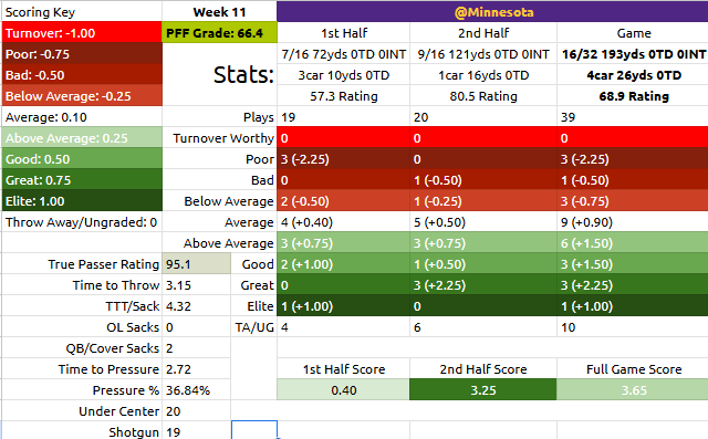 His final scores of 1st Half (0.40) / 2nd Half (3.25) / Game (3.65) gives him a solid “Above Average” game grade for week 11.