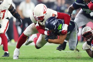 Sep 25, 2025; Glendale, Arizona, USA; Arizona Cardinals linebacker Jordan Burch (52) tackles Seattle Seahawks running back Zach Charbonnet (26) in the third quarter at State Farm Stadium. Mandatory Credit: Mark J. Rebilas-Imagn Images