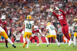 Oct 19, 2025; Glendale, Arizona, USA; Green Bay Packers quarterback Jordan Love (10) watches his pass soar by Arizona Cardinals linebacker Jordan Burch (52) during the second half at State Farm Stadium. Mandatory Credit: Joe Camporeale-Imagn Images