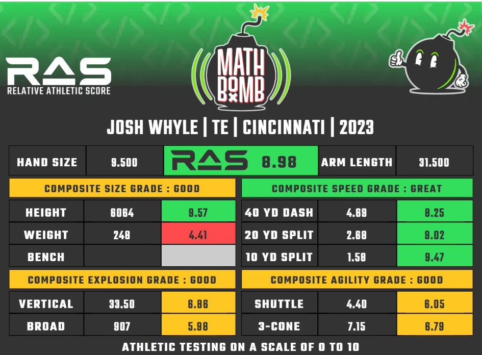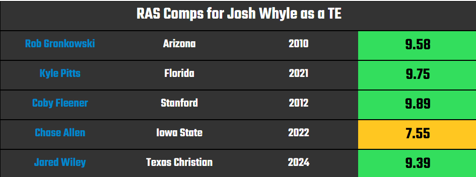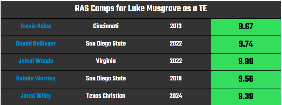 It is important to stress upfront, first, that it doesn’t exactly take a genius to target tight ends that are “kind of like Travis Kelce,” and also that RAS comparables are not even close to destiny (obviously, just look as Musgrave). A lot more goes into becoming an NFL superstar than what happens in jockeys at the combine; however, it does help to identify the bucket of players that might become a certain type of star, which brings us to Josh Whyle.