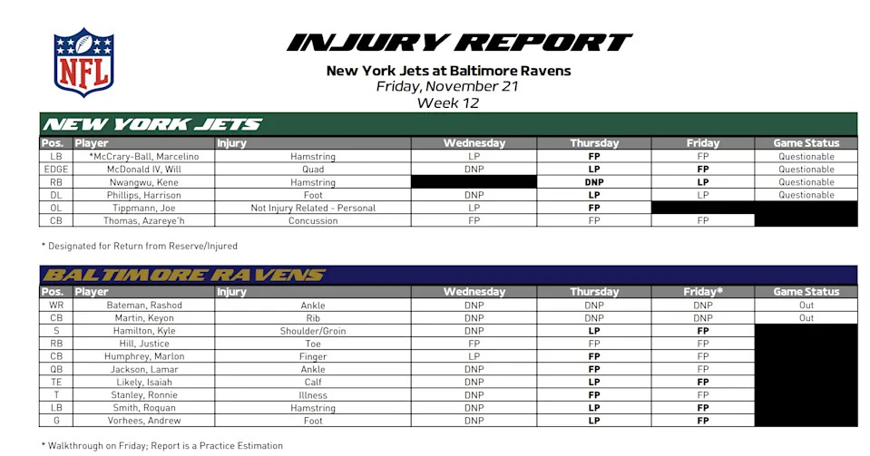 The final injury report for Week 12 has been released for the game between the New York Jets and the Baltimore Ravens. It appears the Jets will be getting starting cornerback Azareye’h Thomas back into the lineup after the rookie missed Week 11 with a concussion.
