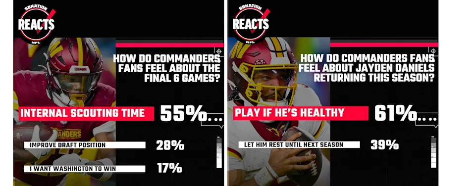 While both questions resulted in majority opinions, they were far from unanimous. I was frankly a bit surprised that nearly 4 of 10 respondents to the survey would prefer coaches to sit Jayden Daniels even if he’s medically cleared, apparently in hopes that the extra rest and recovery time will ensure that he enters the 2026 season fully healthy. Also, it seems significant to highlight that nearly 1 in 3 respondents prefers to prioritize draft position above winning or development of the current roster.