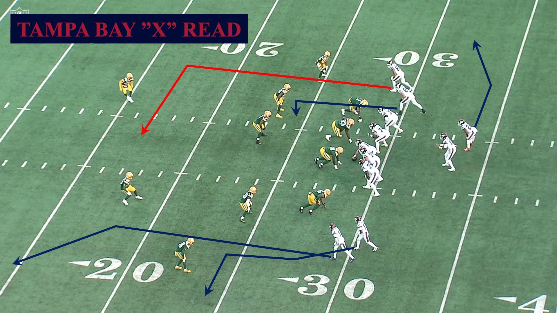 On the Giants play, the right side of the formation is running the “Tampa Bay” concept, a 3-man route concept with a dig from the tight end, a chip release to an arrow route to occupy the hook defender and hi-low read him with the ability to break outside versus man coverage, and a flat route to stretch the defense horizontally.