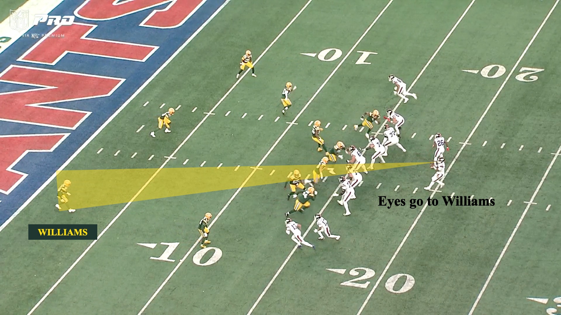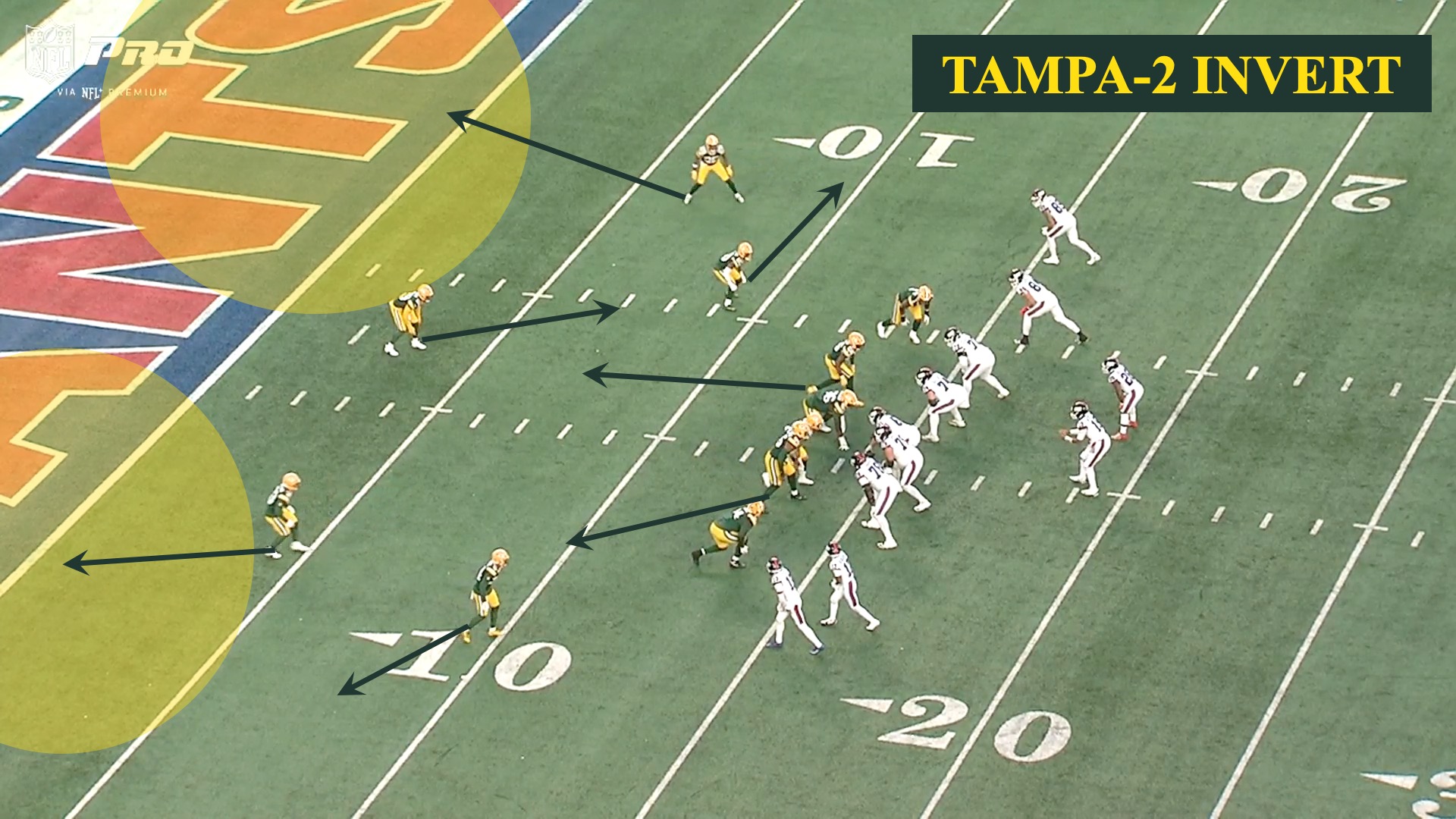 The defense’s post-snap rotation is to Tampa-2 invert with Williams and Keisean Nixon as the deep half players, Xavier McKinney rotating to the weak hook, and Edgerrin Cooper as the middle zone runner.