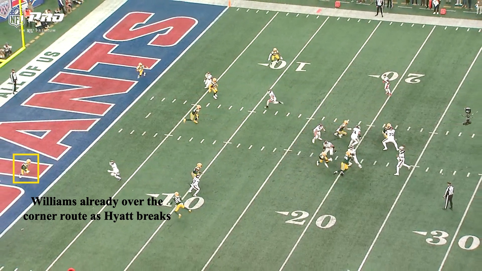 It looks like Hyatt also quit on the route and didn’t anticipate that he would get the ball with Williams playing directly over his route. You can see he slows down and almost stops as the ball sails right past where he’d end up if he kept running full speed to make a play on the ball.