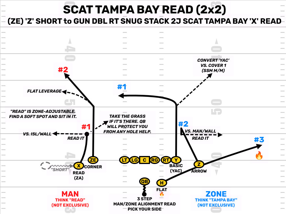 The front side of the play is a short 5-yard read route with an alert corner route over the top. The concept is “pick a side,” meaning the quarterback chooses the side best suited to attack the coverage.