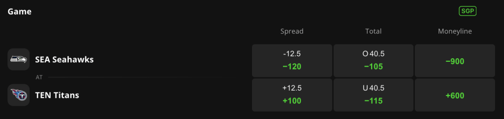 Seattle is a 12.5-point favorite and -900 on the moneyline, while Tennessee is +600 on DraftKings Sportsbook. The game total is set at 40.5 points.