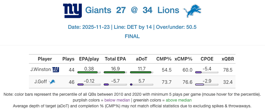 Fourth quarter/Overtime defense — See all of the above. The Giants played with great effort on defense. They gave up some plays to Gibbs and the Detroit offense. They were physical, though, made Goff aware of them, got a turnover and did enough to have a lead.
