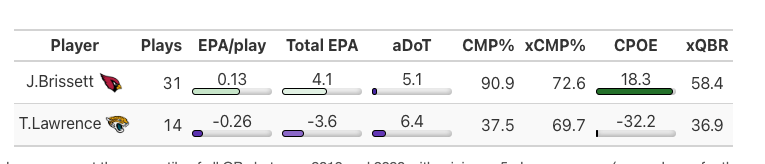 At the half, Trevor Lawrence was 3/8 for 51-yards, one touchdown, one fumble for an Arizona touchdown, and 3 carries for 26-yards (8.7 YPC). Brissett was 20/25 for 161-yards, no touchdowns or turnovers at the half.