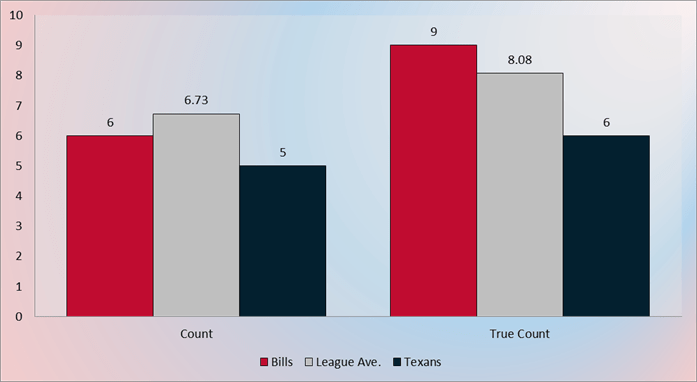 Using the league data (left hand bars) for assessed yards, the Bills are still falling behind the Texans. Not drastically, and almost perfectly in line with league average. As we drift toward more advanced measures that will lead to my proprietary Harm stat, we see that the true yards start to indicate there might be some deeper things going on.