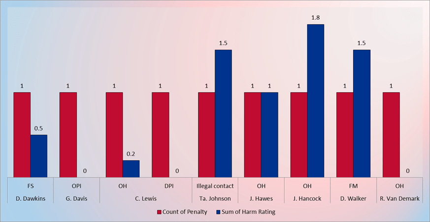 On the surface, Buffalo had a relatively good day on flags, with only 6.5 total Harm. I’ll focus on just a couple penalties as some of these are frankly depressing (hello Dion Dawkins’ false start).