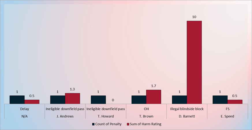 Remember the idea behind Harm: We’re looking to identify the likelihood of impact on a particular flag. This one took away seven points from the Texans. In terms of Harm, that’s meaningful as it allowed the Bills the chance to prevent a touchdown. A strong defensive series from Buffalo kept the Texans to a field goal, meaning this flag did result in a four-point swing in favor of the Bills. If the initial score stood, that would have still kept the margin to a one-score game, but a touchdown and two-point conversion to tie rather than a touchdown or even two field goals for a win.