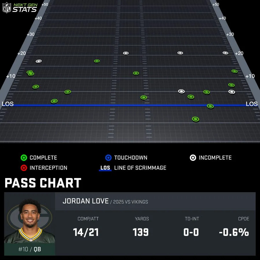 Overall, a limited passing attack, but an effective one. We saw some 3-step quick game, but we also saw a fair bit of the vertical attack they’ve been leaning into more as the season has gone on. The only official attempts behind the line of scrimmage were a TE screen and a checkdown. We saw some bubble screen tags on run plays, but Love didn’t pass on any of those calls (that makes 2 straight weeks where Love has not thrown an RPO).