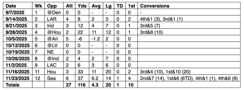 After five games of no first downs for the Titans’ offense out of quarterback runs, they got two in their Week 11 loss to Houston and four in their Week 12 loss to Seattle. Against the Seahawks Ward’s first downs by land accounted for 22 percent of Tennessee’s first downs and they only got one more by rush.