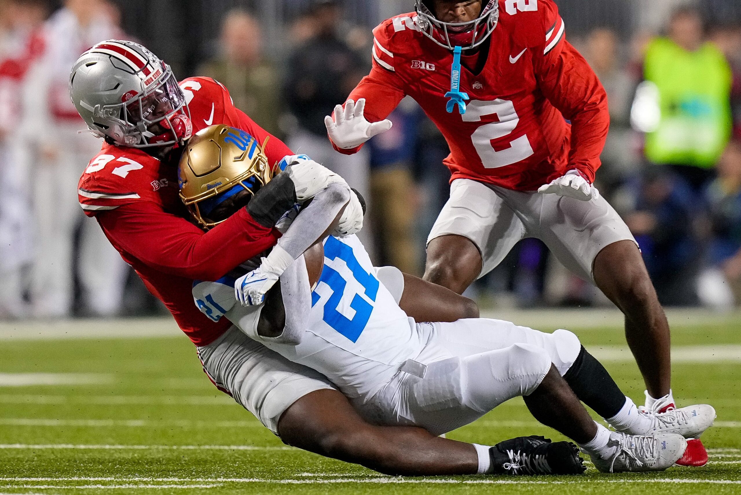 Ohio State Buckeyes defensive end Kenyatta Jackson Jr. (97) tackles UCLA Bruins running back Jaivian Thomas (21) in the first half of the NCAA college football game at Ohio Stadium on Saturday, Nov. 15, 2025 in Columbus, Ohio.