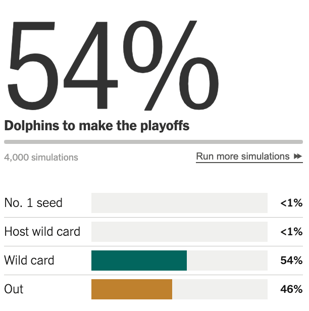 All else equal, if the Dolphins were to win out, according to The Atheltic’s playoff simulator, their playoff odds would sit at around 20%. Now, with some help from around the league, that number could jump to over 50%.