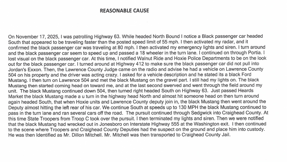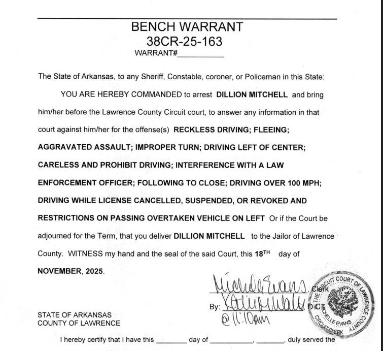 Court records show authorities in Lawrence County have obtained an arrest warrant for Mitchell on charges of felony fleeing, aggravated assault, and first-degree reckless driving, along with a host of other infractions. Because Lawrence County is in the Third Judicial District and Craighead is in the Second Judicial District, he faces two different court cases with two different prosecutors.