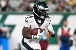 Aug 22, 2025; East Rutherford, New Jersey, USA; Philadelphia Eagles running back Montrell Johnson Jr. (34) runs with the ball during the first quarter against the New York Jets at MetLife Stadium. Mandatory Credit: Mark Smith-Imagn Images