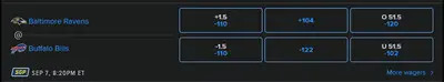 FanDuel Sportsbook has released opening odds for Bills-Ravens Week 1, and the numbers see bettors taking Buffalo over Baltimore. As of publishing, the Bills are 1.5-point favorites (-1.5) over the Ravens, with a -122 moneyline, and an O/U set at 51.5 (-102 for Buffalo).