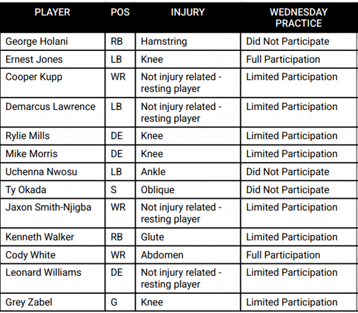 The Seahawks’ first injury report of the week lists OLB Uchenna Nwosu, S Ty Okada and RB George Holani as non-participants. The injuries to Holani and Okada factored into Seattle’s decision to sign Cam Akers and Quandre Diggs, respectively. Mike Macdonald said Okada, who’s filling in for Julian Love, is day-to-day. Love, who’s on IR, won’t be back to practice until next week at the earliest. LB Ernest Jones IV, who didn’t play last week, was a full participant Wednesday.Mentions