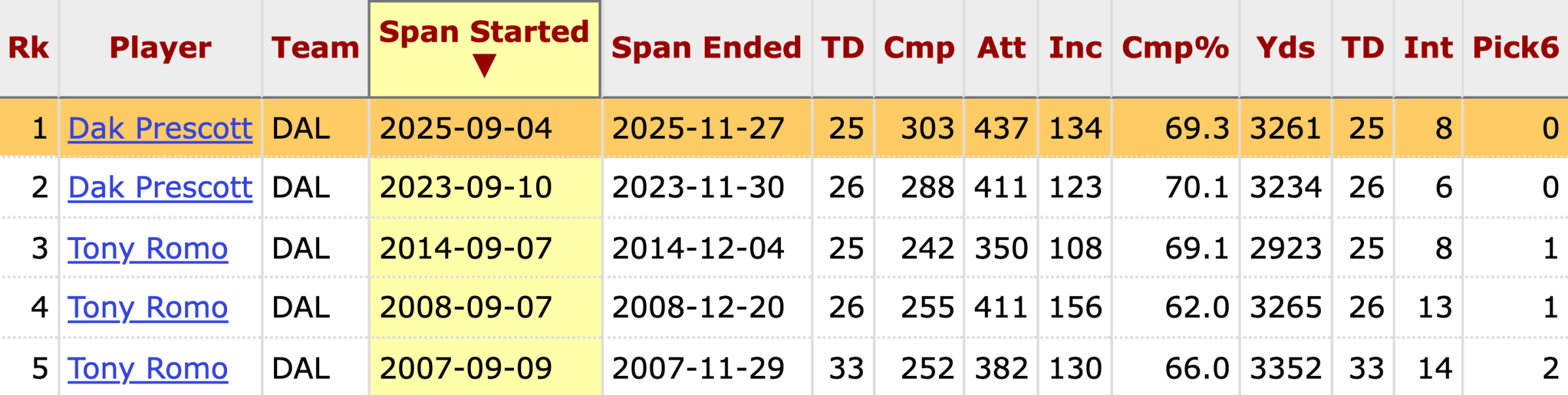 This is only the fifth instance since 1970 of a Cowboys quarterback doing this. Dak himself did it two years ago during the season he finished runner-up for MVP and the color analyst from the Thanksgiving Day in Tony Romo did it three times.