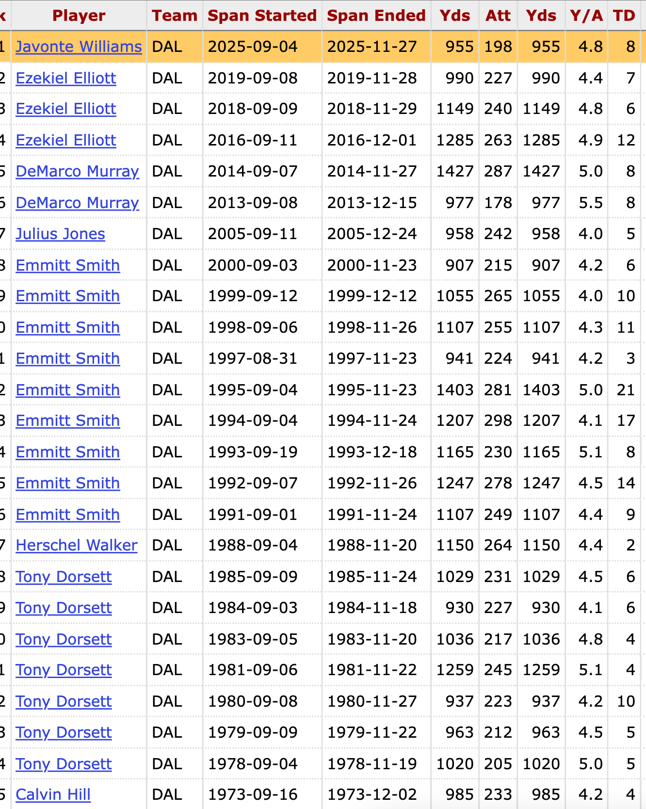 Javonte Williams has been a revelation this season. His season is the 25th for the Cowboys since 1970 where a player has amassed 900 rushing yards through the first 12 games of a season.