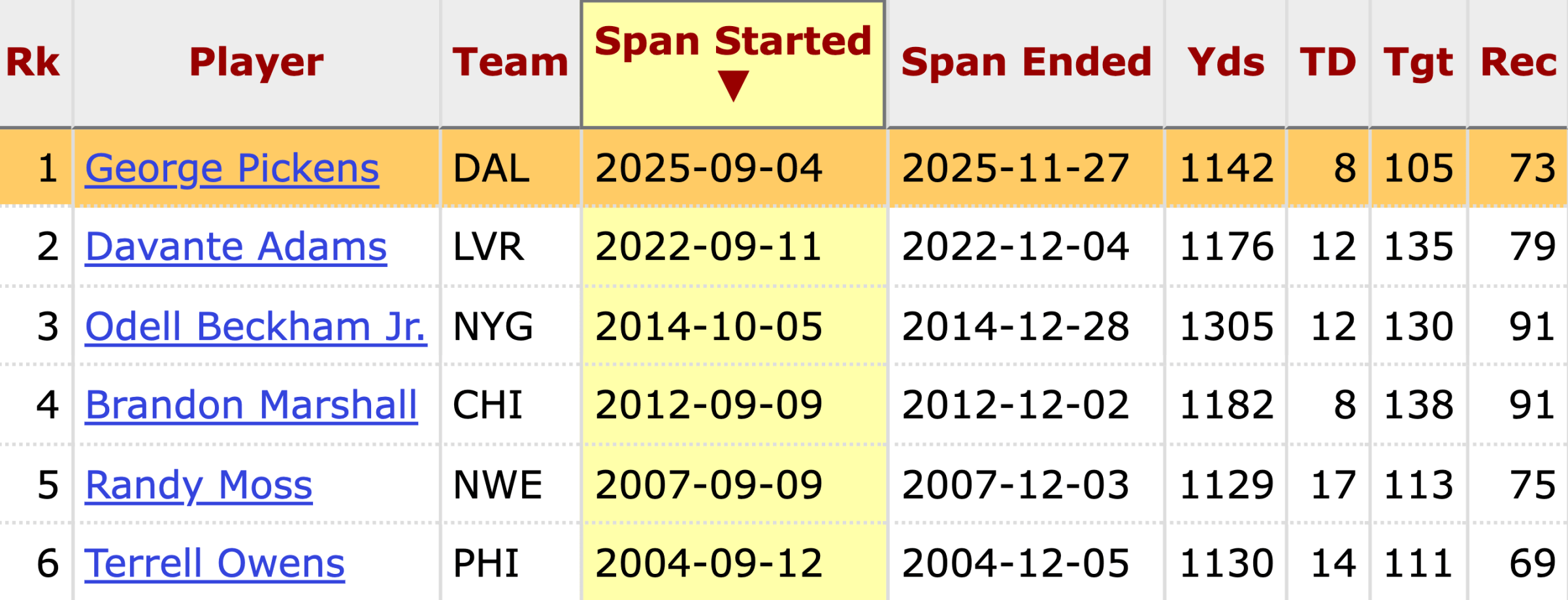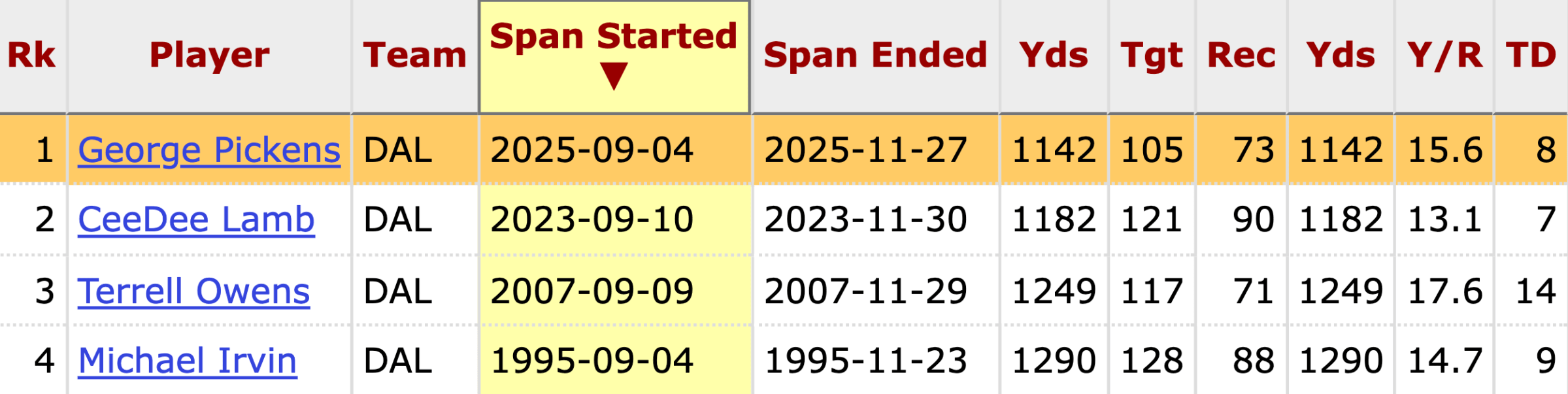 I wanted to see how many Cowboys receivers have put up 1,100 yards through the first 12 games of a season which Pickens has done as noted. There are only four (since 1970) and the list is pretty special.