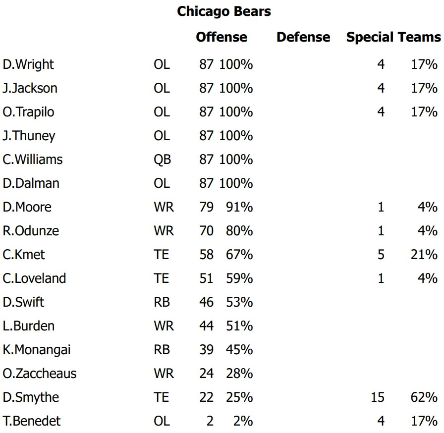 Let’s look at the Bears’ playing time breakdowns and a few individual stats from the game.