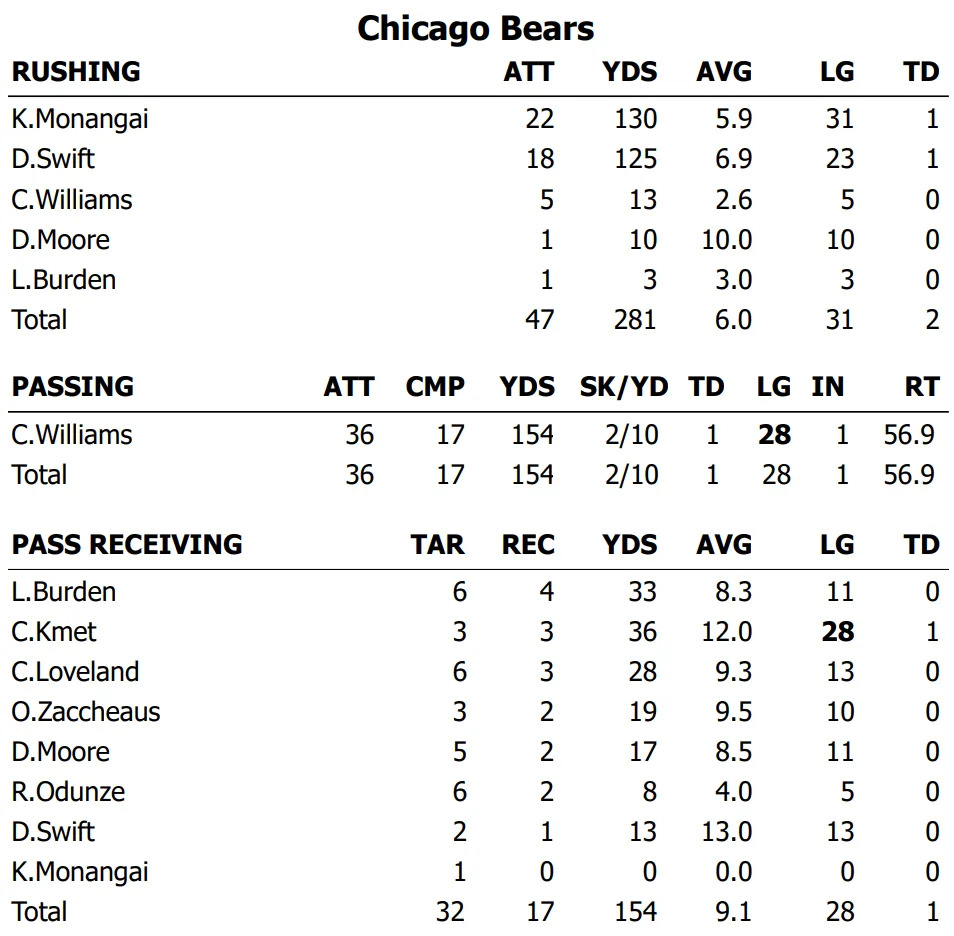 Safeties Kevin Byard III and Jaquan Brisker led the Bears with 6 tackles each. Byard added an interception, and Brisker had a pass defended.