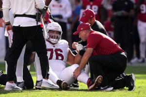 Oct 6, 2024; Santa Clara, California, USA; Arizona Cardinals guard Will Hernandez (76) is examined by medical personnel during the fourth quarter against the San Francisco 49ers at Levi’s Stadium. Mandatory Credit: Darren Yamashita-Imagn Images