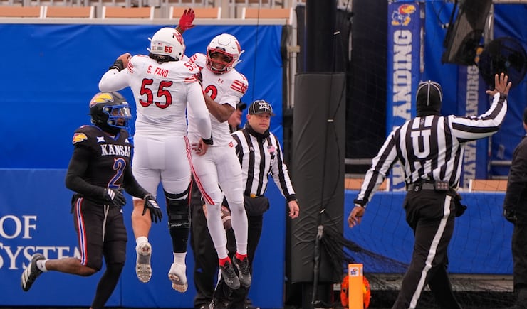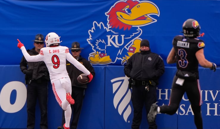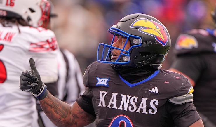 Kansas running back Daniel Hishaw Jr. celebrates after scoring a touchdown during game against Kansas, Friday, Nov. 28, 2025, in Lawrence, Kan. | AP