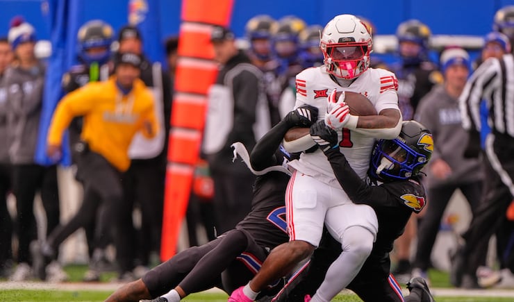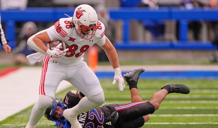 Utah tight end Dallen Bentley, center, is tackled by Kansas linebacker Bangally Kamara (1), safety Lyrik Rawls, center back, and linebacker Trey Lathan, right, during game Friday, Nov. 28, 2025, in Lawrence, Kan. | AP