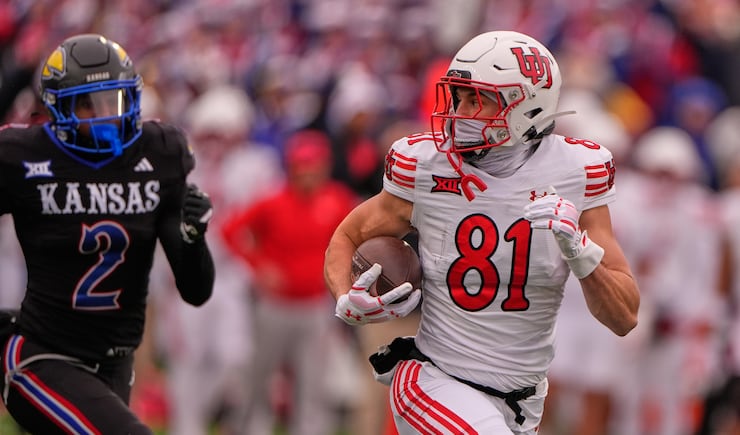 Utah tight end JJ Buchanan (81) gets past Kansas safety Lyrik Rawls (2) to run for a touchdown during game Friday, Nov. 28, 2025, in Lawrence, Kan. | AP