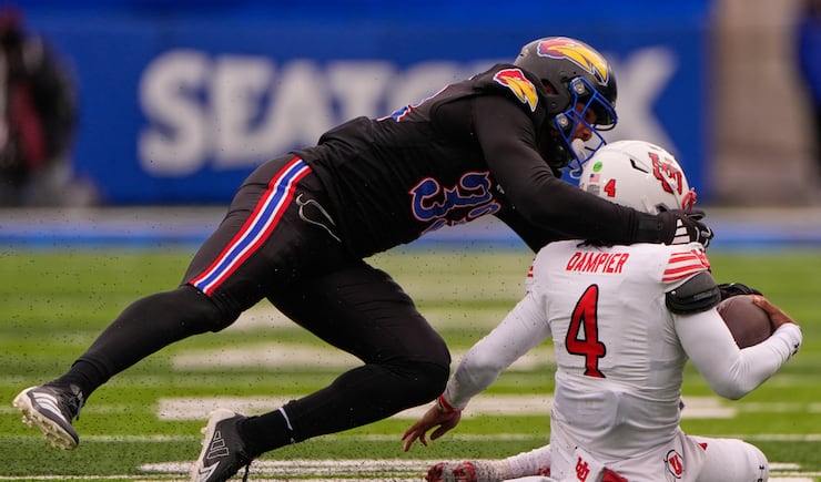 Kansas defensive end Leroy Harris III (33) tackles Utah quarterback Devon Dampier (4) during game Friday, Nov. 28, 2025, in Lawrence, Kan. | AP